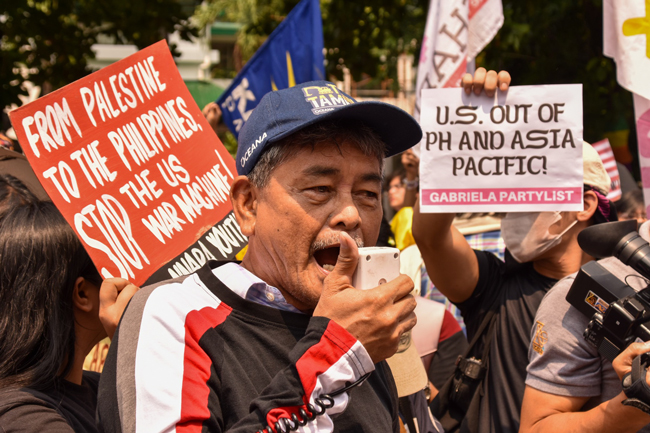 6月12日,是菲律宾独立日,当天多个民间团体在美国驻菲律宾大使馆前举行集会抗议活动,抗议民众谴责美国在菲的军事存在不断升级,要求美国停止对菲的军事干预。