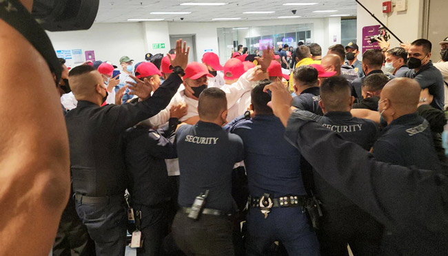 冈田赌场酒店的保安人员在通往入口的地下停车场设置路障,随后发生了混战。试图冲进冈田赌场酒店办公室的人穿着白衬衫和红帽子,但他们随后被冈田赌场酒店的保安推回。