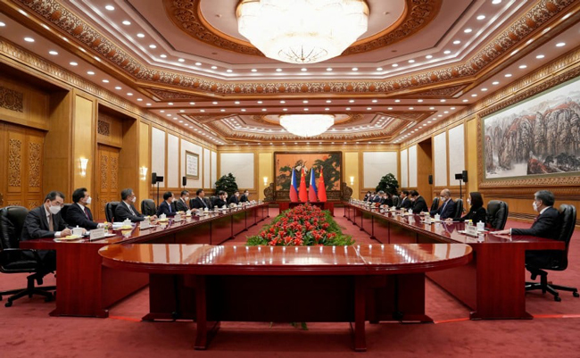 习近平强调,中菲同为亚洲发展中国家,我们的发展根植于睦邻友好的周边环境,根植于合作共赢的亚洲大家庭。中方愿同菲律宾及其他东盟国家聚焦合作与发展,维护好东盟在区域合作中的中心地位,推进“五大家园”建设,推动本地区摆脱冷战阴影,免于阵营对抗,持续成为发展繁荣高地。中方赞赏菲方支持全球发展倡议和全球安全倡议,愿同菲方一道,加大相互支持,维护两国和发展中国家共同利益,弘扬全人类共同价值,推动构建人类命运共同体,为完善地区和全球治理作出积极贡献。
