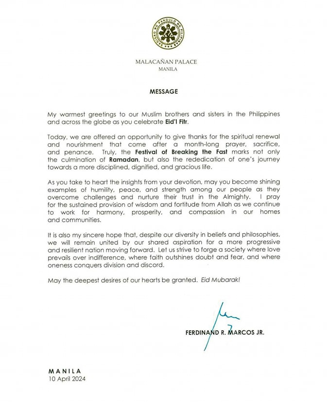 4月10日,菲律宾总统马科斯值此开斋节之际,向菲律宾和全球的穆斯林社区致以热烈的问候,并发表了庆祝开斋节的文告。